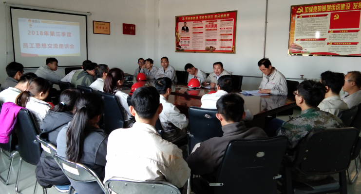 為了充分了解員工的思想動(dòng)態(tài),征詢(xún)廣大職工意見(jiàn)和建議,幫助員工解決工作和生活中的實(shí)際困難,加強員工隊伍建設,體現公司以人為本的管理理念,促進(jìn)企業(yè)更加健康、和諧發(fā)展,寧夏興昊永勝鹽業(yè)科技有限公司于10月10日組織召開(kāi)了2018年第三季度員工思想交流座談會(huì )。會(huì )議由鹽業(yè)公司總經(jīng)理尚繼榮同志主持,鹽業(yè)公司黨支部副書(shū)記王志杰、綜合科科長(cháng)張偉及職工代表列席參加會(huì )議。