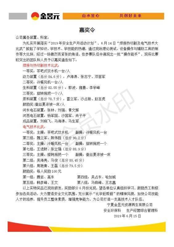 比賽結束后,公司對此次參加比賽的所有人員頒布了嘉獎令,鼓勵員工在今后的工作中提高操作水平,努力奮進(jìn),爭做優(yōu)秀員工!