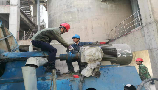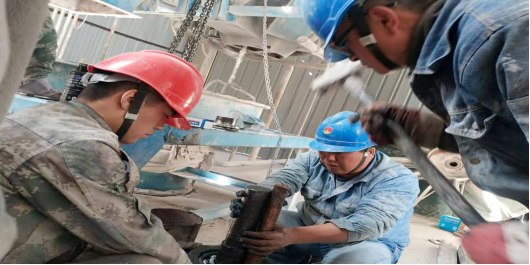 在其他設備檢維修現場(chǎng),工人們依然具備這種“責任心”,如生料裝置接力風(fēng)機維修現場(chǎng),檢維修工人通過(guò)測振儀更換“主軸”。