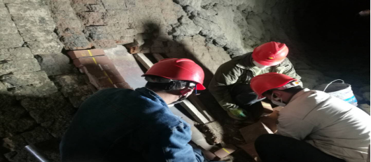 窯磚緊固。加塞,在轟鳴的風(fēng)鎬聲中,夾雜著(zhù)交替起落的敲擊聲,工友們,正頂著(zhù)滿(mǎn)面的塵灰完成作業(yè)。