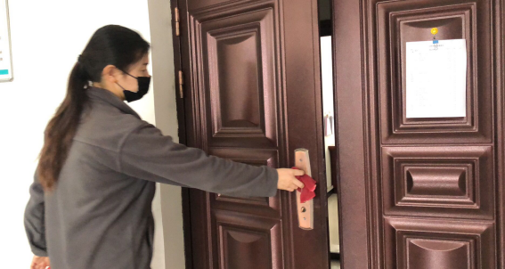擦拭操作臺、門(mén)把手,工作的有條不紊。