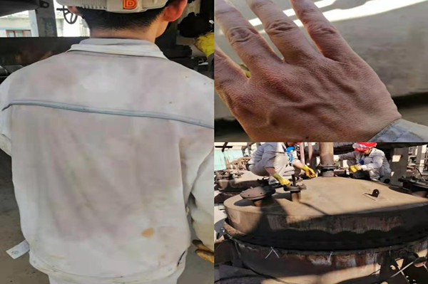 大家都知道轉化現場(chǎng)溫度很高,而且近期外界氣溫已高達三十七八度。轉化現場(chǎng)溫度都接近于45度左右,如同一個(gè)大蒸籠,而轉化人員卻每天都在這個(gè)大蒸籠里工作;每每投甩完一臺轉化器后,衣服已全部被汗水浸透;到汗珠流到眼睛后,加之與氯化氫氣體接觸,眼睛完全睜不開(kāi);在拿掉塑膠手套的那一刻,一雙手被捂的發(fā)白發(fā)皺;如同在水里浸泡了數小時(shí)一樣,但是就在這樣的工作環(huán)境下,卻沒(méi)有一個(gè)人退縮,都在堅守著(zhù)自己的工作崗位,做出最大的奉獻。