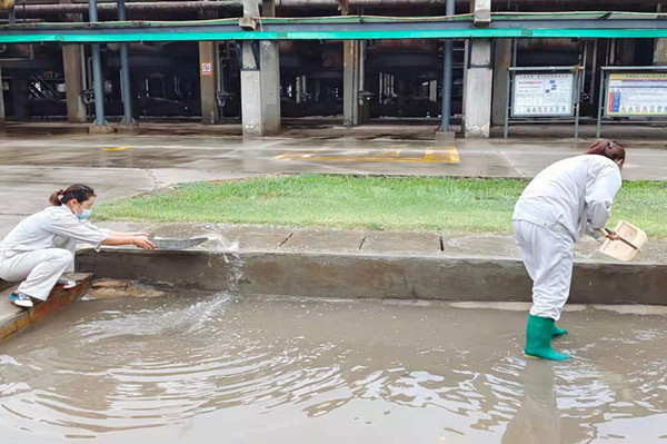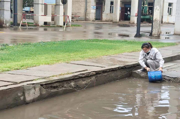 無(wú)論刮風(fēng)還是下雨,天氣有多惡劣 ,總有一群人,她們始終是堅守在崗位一線(xiàn)的最美員工,那就是從事質(zhì)檢分析的女工們。其實(shí)在四班三倒的日子里,她們最頭疼的不是工作忙,而是遇見(jiàn)雨雪天氣,特別是下雨天時(shí),出門(mén)去現場(chǎng)取樣就變得困難了很多,有時(shí)候為了取樣方便,她們寧愿選擇不打傘、不穿雨衣,一趟下來(lái),衣服和鞋子差不多全濕透了。這不,那一晚她們就迎來(lái)了一夜的雨,從小雨逐漸變成中雨,聽(tīng)著(zhù)外面的雨聲,她們如坐針氈,萬(wàn)一變成暴雨可怎么辦,雨一直不停又怎么辦,外面的雨已經(jīng)越下越大,但到了取樣時(shí)間她們不畏困難做好防護準時(shí)到現場(chǎng)取樣,她們堅信遇到再大困難也要戰勝困難,去完成自己的工作。終于等到了天亮,雨也停了下來(lái),等待她們的就是清理積水?粗(zhù)那么一大片積水,沒(méi)有抽水泵,這讓她們犯起了難,思考了片刻,她們決定用最老土的辦法使用水桶、笤帚、簸箕清理積水,說(shuō)干就干,水比較深,只好換上了雨鞋,大家分工明確,掃地掃,鏟地鏟,提得提,倒得倒,一會(huì )的功夫積水已經(jīng)少了很多,在大家緊密的配合下,最終把坑里積水全部清理了出去。