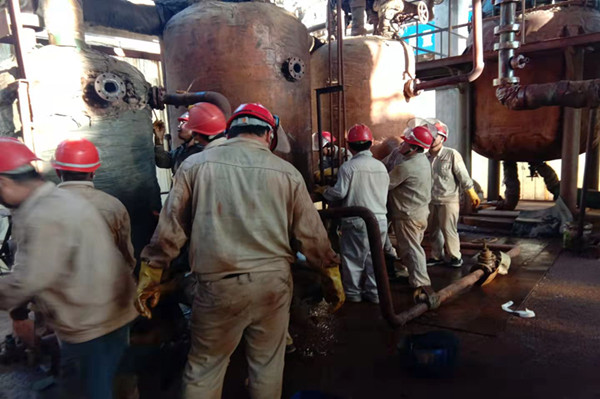 在完成了相關(guān)作業(yè)的準備工作,參與檢修人員穿戴好各類(lèi)防護用品,辦理各類(lèi)票證后,大家就進(jìn)入到檢修現場(chǎng)。更換再沸器設備前,必須先排盡設備內的氯化鈣,由于連接管線(xiàn)不能徹底排盡設備管線(xiàn)內物料,只能通過(guò)人工接力的方式,將管線(xiàn)剩余的氯化鈣一桶一桶的接出,并迅速的倒入回收貯罐內。整個(gè)過(guò)程必須密切協(xié)作,否則就會(huì )造成氯化鈣的大量外溢,在環(huán)保壓力如此大的今天,是絕對不容許的。經(jīng)過(guò)近一個(gè)小時(shí)的努力,設備管線(xiàn)內的氯化鈣終于排放干凈。此時(shí)每個(gè)人的臉上都浸滿(mǎn)了汗水,這也是檢修人員最美麗的時(shí)刻。