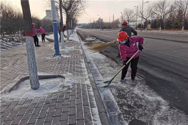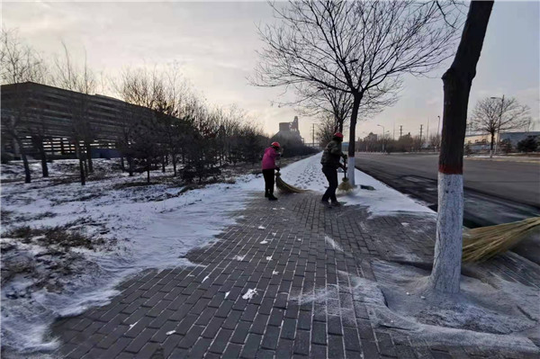 裝置門(mén)前的松樹(shù)上掛滿(mǎn)雪球看著(zhù)調皮且可愛(ài),九點(diǎn)過(guò)后太陽(yáng)開(kāi)始照射,遠遠望去整個(gè)廠(chǎng)區銀光閃閃,讓人移不開(kāi)眼。雖然雪景美麗但因為路面積雪會(huì )導致員工滑倒等危險,且廠(chǎng)區其他生產(chǎn)場(chǎng)地都需繼續生產(chǎn),不能因下雪而影響,所以在欣賞完雪景后的我們也開(kāi)始了積雪大清掃活動(dòng)。