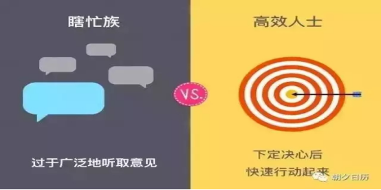 缺乏決斷力是瞎忙族的通病,做事害怕犯錯,行動(dòng)時(shí)畏首畏尾。為了讓所有人滿(mǎn)意,過(guò)于廣泛地(甚至是毫無(wú)必要地)征求意見(jiàn),結果必然是眾口難調,導致更加難以決策。而高效的人明白,行動(dòng)力才是決定成敗的關(guān)鍵,沒(méi)有行動(dòng),一切都是零。他們會(huì )適當聽(tīng)取意見(jiàn),但是更相信自己的判斷,下定決心之后,快速地行動(dòng)起來(lái)!用行動(dòng)贏(yíng)得成功和夢(mèng)想!