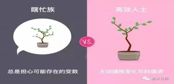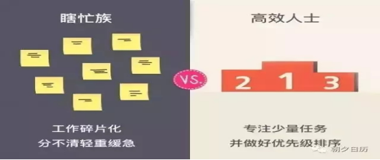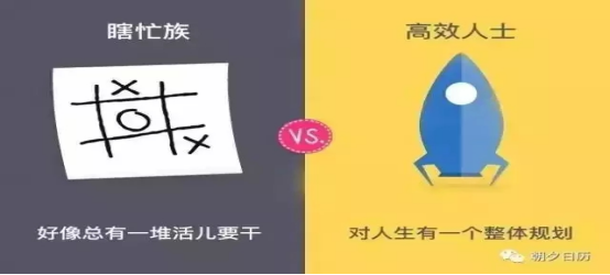 瞎忙族和高效的人的時(shí)間都安排得很滿(mǎn),但是卻有本質(zhì)的區別。瞎忙族是沒(méi)有目標和方向的忙碌,整天被外部力量推著(zhù)趕著(zhù),永遠有忙不完的活,永遠在救火,但是卻說(shuō)不上來(lái)忙了些啥,為了啥。而高效的人的一個(gè)共同特點(diǎn),就是對自己的人生有清晰的規劃,永遠知道自己的目標是什么,每一個(gè)階段的奮斗有什么意義。他們的忙碌是充實(shí),而不是庸碌。