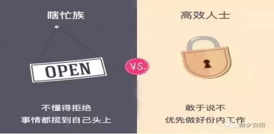 很多瞎忙族都是老好人,不懂得(或者不敢)拒絕別人,各種事情都往自己頭上攬。結果忙得焦頭爛額,連自己的份內工作都沒(méi)做好,被上司責備。別人的事也做得馬馬虎虎,兩頭不討好。高效的人并非不熱心助人,但是能分清主次,明白份內工作都沒(méi)做好的情況下,其他事情做得再多也沒(méi)意義。條件不允許的時(shí)候懂得合情合理地拒絕別人。