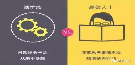 瞎忙族經(jīng)?雌饋(lái)好像很有執行力,接到任務(wù)說(shuō)干就干,風(fēng)風(fēng)火火的。但是經(jīng)常干到一半,發(fā)現方向錯了!一切又得推倒重來(lái),反反復復,效率低不說(shuō),還浪費公司資源。而高效的人不僅能埋頭干活,也非常注重抬頭看路。行動(dòng)之前,花必要的時(shí)間想清楚問(wèn)題的本質(zhì)是什么,怎么做最合理,有沒(méi)有更優(yōu)的方案?低效率和無(wú)用功是他們極力避免的。