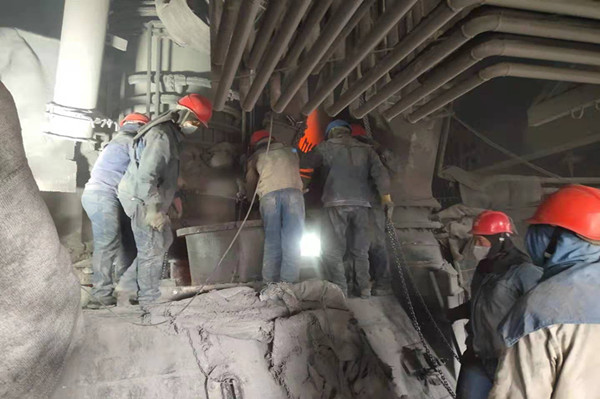 剛踏上平臺,首先映入筆者眼簾的,是一群穿著(zhù)藍色牛仔工裝的工友們正在有序的拆卸二層爐面保溫材料準備更換燒損下料柱。只見(jiàn)他們個(gè)個(gè)干勁十足、衣服早已被汗水浸濕、黑乎乎的臉看不清誰(shuí)是誰(shuí)?他們顧不得爐面余溫的熾熱、爐面積灰的刺鼻積極投入到檢修中,一時(shí)間吶喊聲、叉車(chē)鳴笛聲,起重吊車(chē)的口哨聲,聲聲作響,猶如一首交響樂(lè )響徹整個(gè)檢修現場(chǎng)!在大家的齊心協(xié)力下,燒損下料柱順利被拆下,并按時(shí)裝好!