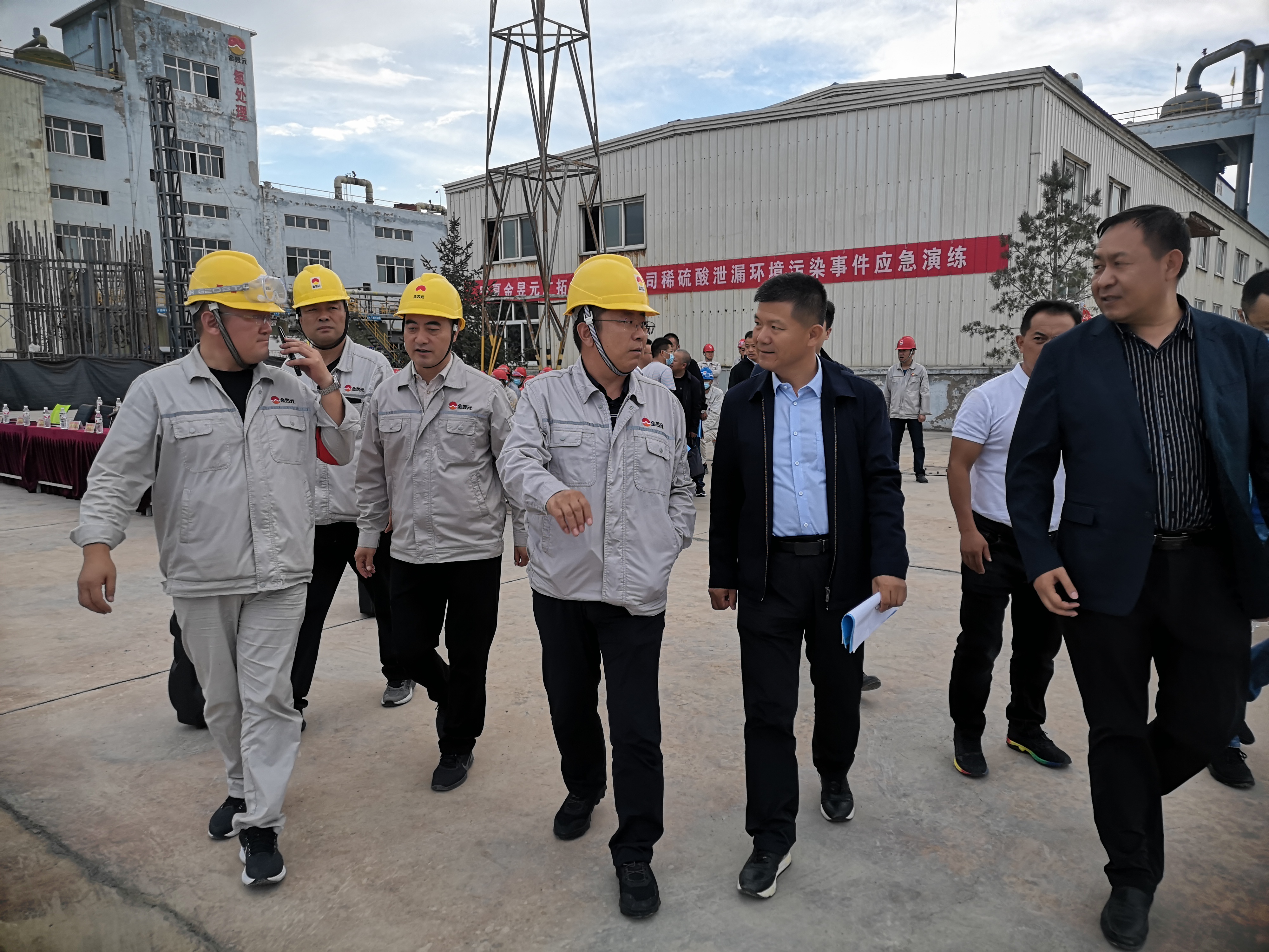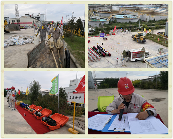 “報告總指揮,各演練部門(mén)準備完畢,氯乙烯球罐單體泄漏應急演練是否開(kāi)始!薄伴_(kāi)始!”隨著(zhù)演練總指揮、片區副總經(jīng)理、廣拓能源總經(jīng)理賈存富的一聲令下,應急演練正式開(kāi)始!北敬窝菥氃O定為一般突發(fā)事件應急響應,演練內容是:廣拓能源有限公司廢酸處理稀硫酸罐排污閥泄露,由于稀硫酸泄漏量較大,啟動(dòng)突發(fā)應急預案。主要演練現場(chǎng)警戒、人員撤離、筑壩攔截預防稀硫酸外溢、危險廢物收集。