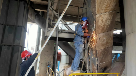 預熱器、烘干破、生料磨斜槽管道等檢修區域他們化身蜘蛛俠,腰纏安全帶,頭戴安全帽,手握焊槍……