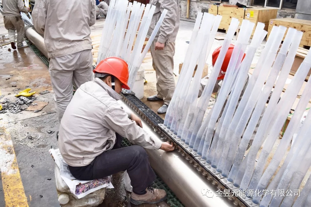 氯乙烯裝置檢修現場(chǎng),檢修人員正四、五人一組,齊心協(xié)力的給除霧器濾筒裹上厚厚的“棉衣”,為檢修VI轉化除霧器做好準備工作。