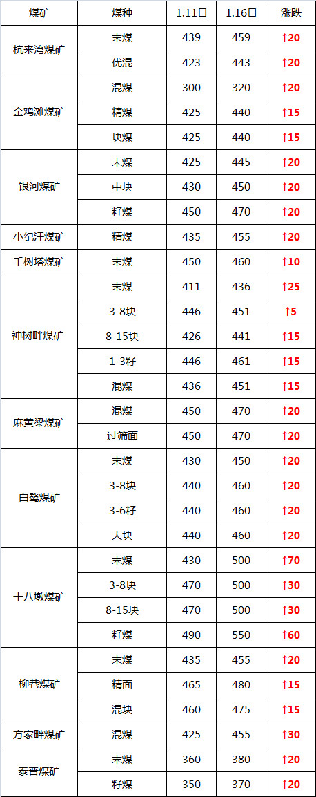 據榆林煤炭交易中心數據統計,與1月11日相比,目前榆林的在產(chǎn)煤礦價(jià)格漲幅最高達到了70元/噸。
