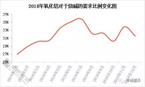 根據卓創(chuàng )監測,2018年氧化鋁對于燒堿的需求占比達到33%-34%,如上圖所示,2018年大多數月份氧化鋁行業(yè)對燒堿需求比例均超過(guò)30%,其中個(gè)別月份最高需求占比達到35.81%左右,最少的月份需求占比也在27%左右。毫無(wú)疑問(wèn),氧化鋁是目前燒堿下游需求行業(yè)中的“頂梁柱”般的存在,對燒堿市場(chǎng)起到明顯剛性需求支撐,是燒堿行業(yè)最值得信賴(lài)的需求點(diǎn)。