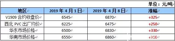 沉寂3個(gè)月的PVC,踏入4月后表現可謂突飛猛進(jìn)。尤其在PVC期貨實(shí)現移倉換月后,漲價(jià)動(dòng)能得到充分激發(fā),大舉突破震蕩狀態(tài),從4月1日至4月8日,大商所V1909合約收盤(pán)價(jià)漲幅近5.0%。而PVC生產(chǎn)廠(chǎng)家在庫存低位的情況下看漲情緒較強,助推漲價(jià)潮在短時(shí)間內愈演愈烈。