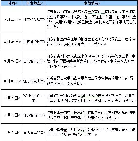 “3·21”特別重大爆炸事故發(fā)生以后,安全事故并沒(méi)有由此停歇,并再度頻繁上演。接連的爆炸事件引起政府和群眾的高度重視,事故發(fā)生后全國在化工領(lǐng)域開(kāi)展;访芗脚挪,化工行業(yè)整治力度再上臺階。作為本輪事故多發(fā)地的江蘇省,亦于4月1日出臺史上最嚴的整治方案:要求到2020年底,江蘇省化工生產(chǎn)企業(yè)數量減少到2000家,到2022年,全省化工生產(chǎn)企業(yè)數量不超過(guò)1000家。4月5日,江蘇鹽城決定徹底關(guān)閉響水化工園區,鹽城這一舉措,外界認為無(wú)疑于是“壯士斷腕”。