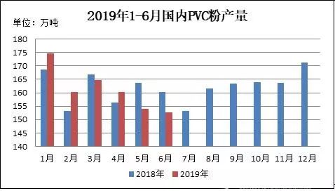 1至3月中旬,PVC行業(yè)開(kāi)工負荷維持在84.5%左右,明顯高于2018年同期的81.5%。但3月底至4月,化工行業(yè)安全事故頻發(fā),;沸袠I(yè)安全生產(chǎn)監管力度加大,PVC企業(yè)對此也高度重視,因此春檢期間,檢修企業(yè)明顯多于2018年,企業(yè)檢修時(shí)間也出現延長(cháng)。1至6月,國內PVC企業(yè)檢修損失產(chǎn)量為79.01萬(wàn)噸,同比增加27.3%,其中4至6月的檢修損失產(chǎn)量為63.64萬(wàn)噸,同比激增59.4%。上半年行業(yè)開(kāi)工負荷前高后低,國內產(chǎn)量同比2018年微幅下降。據卓創(chuàng )資訊統計,1至6月,國內PVC粉產(chǎn)量為966.6萬(wàn)噸,同比下降0.3%。