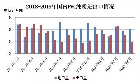 圖5 2018-2019年國內PVC純粉進(jìn)出口情況