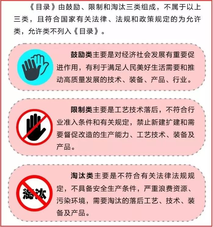 目錄(2019年本)共涉及行業(yè)48個(gè),條目1477條,其中鼓勵類(lèi)821條、限制類(lèi)215條、淘汰類(lèi)441條。不屬于以上三類(lèi),且符合國家有關(guān)法律、法規和政策規定的為允許類(lèi),不列入《目錄》。