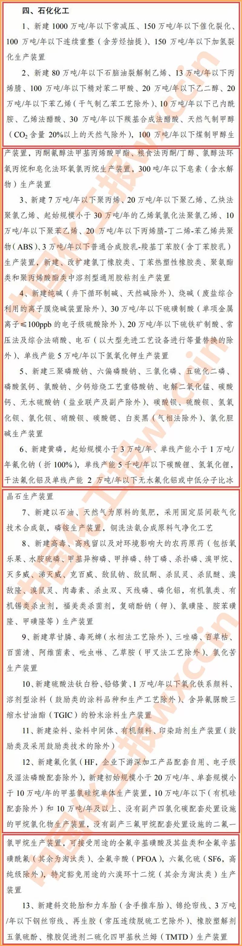 石化化工行業(yè)鼓勵類(lèi)有17大類(lèi),比征求意見(jiàn)稿少了3大類(lèi),包括:高標準油品生產(chǎn)技術(shù)開(kāi)發(fā)與應用,煤經(jīng)甲醇制對二甲苯;硫、鉀、硼、鋰、溴等短缺化工礦產(chǎn)資源勘探開(kāi)發(fā)及綜合利用;零極距、氧陰極等離子膜燒堿電解槽節能技術(shù)、廢鹽酸制氯氣等綜合利用技術(shù)、鉻鹽清潔生產(chǎn)新工藝的開(kāi)發(fā)和應用;10 萬(wàn)噸/年及以上離子交換法雙酚 A、15 萬(wàn)噸/年及以上直接氧化法環(huán)氧丙烷、20 萬(wàn)噸/年及以上共氧化法環(huán)氧丙烷、萬(wàn)噸級己二腈生產(chǎn)裝置;高效、安全、環(huán)境友好的農藥新品種、新劑型、專(zhuān)用中間體、助劑的開(kāi)發(fā)與生產(chǎn);染料、有機顏料及其中間體清潔生產(chǎn)、本質(zhì)安全的新技術(shù)等。