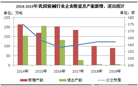 圖1 2014-2019年中國燒堿行業(yè)企業(yè)數量及產(chǎn)能新增、退出統計