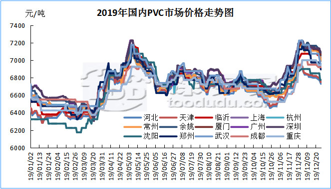2019年中國國內PVC市場(chǎng)仍舊是價(jià)格高位整理的一年,全年價(jià)格波動(dòng)區間以華東主流為例在6440-7225元/噸之間,高低價(jià)差785元,從走勢圖以及月均價(jià)走勢可以看出,2019全年經(jīng)歷兩撥較大幅度的推漲,其中第一季度1-3月份市場(chǎng)較為低迷,處于低谷整理期,4月份開(kāi)始市場(chǎng)價(jià)格開(kāi)始緩慢上漲,經(jīng)歷不斷的上漲價(jià)格在5月中旬開(kāi)始達到年內第一次高點(diǎn),價(jià)格達到高點(diǎn)后,需方承受能力有限,價(jià)格開(kāi)始下行,下行至6月中下旬后,市場(chǎng)開(kāi)始進(jìn)入緩慢的整理期,長(cháng)達4個(gè)月,6月中下旬-10月中旬,價(jià)格一直處于小幅震蕩整理中,供需雙方的博弈一度令PVC整體產(chǎn)業(yè)鏈進(jìn)入迷茫期,多數行業(yè)內人士甚至認為PVC產(chǎn)品的下跌大周期開(kāi)始來(lái)臨,我們回顧下往年的PVC行情,其價(jià)格在15年5月初達到最低點(diǎn)后內蒙出廠(chǎng)4350元/噸含稅,價(jià)格在歷史低點(diǎn)后開(kāi)始不斷反彈,在經(jīng)歷了16-18年的整理后,在19年中國國內PVC市場(chǎng)仍占據高點(diǎn),四年間PVC生產(chǎn)企業(yè)賺的盆滿(mǎn)缽滿(mǎn)。但下游制品企業(yè)卻苦不堪言,并且自18年國家稅控改革以來(lái),次終端貿易商對稅票逐漸失去控制,導致次終端利潤不斷下滑,規范的市場(chǎng)導致票貨分離減少。而在整個(gè)PVC產(chǎn)業(yè)鏈中,生產(chǎn)企業(yè)占據越來(lái)越多的話(huà)語(yǔ)權,從而導致了雖然我們看到在迷茫期過(guò)后,第四季度國內PVC市場(chǎng)仍舊迎來(lái)年底第二次大漲,此次上漲把PVC價(jià)格推上了真正的年底高點(diǎn)。第四季度的上漲導火線(xiàn)為內蒙企業(yè)裝置出現意外事件停產(chǎn),市場(chǎng)炒作聲漸起,價(jià)格開(kāi)始上漲,而隨后的11-12月份,在期貨的帶動(dòng)下,價(jià)格不斷被推上新高。12月中旬需方面對如此高的價(jià)格開(kāi)始產(chǎn)生抵觸心理。而此時(shí)的年度備貨來(lái)臨,市場(chǎng)不但沒(méi)有復漲反而開(kāi)始進(jìn)入蕭條期,價(jià)格開(kāi)始下滑。