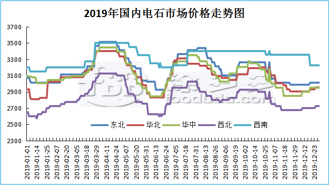 2019年中國國內電石走勢上半年跟隨PVC走勢類(lèi)似,第一季度震蕩上行整理,4月份到達年度高點(diǎn),但隨后價(jià)格開(kāi)始下行,下行至6月中旬又開(kāi)始震蕩上漲,隨后的三四季度震蕩走低中。整體來(lái)看作為PVC上游原料,電石的走勢類(lèi)似于PVC走勢,但并不完全相同,尤其下半年,我們可以推測,下面的PVC收到資金以及市場(chǎng)炒作以及期貨方面的影響較大,并不是從供需、原料方面受到影響。