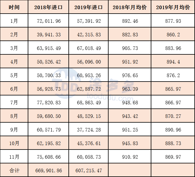 2019年1-11月累計進(jìn)口數量為607215.47噸,同比去年減少62686.39噸。跌幅9.36%,國內產(chǎn)能供給充裕,進(jìn)口量大幅下跌。
