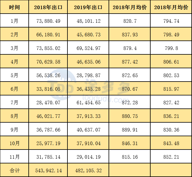 2019年1-11月累計出口數量為482105.32噸,同比去年減少61836.82噸。跌幅11.37%,進(jìn)出口抵消來(lái)看,國內市場(chǎng)供需變化不大。出口數量的減少彌補了進(jìn)口的減少。