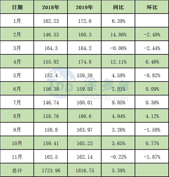 2019年1-11月PVC累計產(chǎn)量1816.75萬(wàn)噸,同比去年減少92.79噸。漲幅5.38%,產(chǎn)能的凈增是產(chǎn)量增加的主要原因。