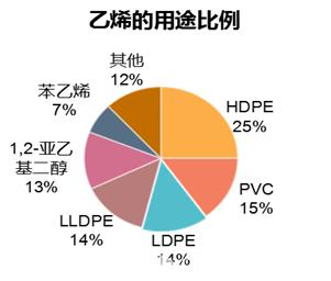 聚乙烯(簡(jiǎn)稱(chēng)“PE”)以及聚氯乙烯(簡(jiǎn)稱(chēng)“PVC”),都與乙烯有相當密切的聯(lián)系。乙烯源于液化天然氣、液化石油氣、輕柴油、重油或原油等經(jīng)裂解產(chǎn)生的裂解氣中分出,亦可以從焦爐煤氣中產(chǎn)生,還可以從乙醇脫水中獲得。在全球聚乙烯制作方法中,其中44%為原油產(chǎn)出石腦油制乙烯,43%為天然氣產(chǎn)出乙烷氣制乙烯,13%為煤炭/天然氣產(chǎn)出甲醇制乙烯。在乙烯的所有用途中,PE和PVC對乙烯的使用量最大,分別占比53%和15%。