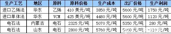 表1 2020年4月上旬PVC生產(chǎn)成本及利潤測算