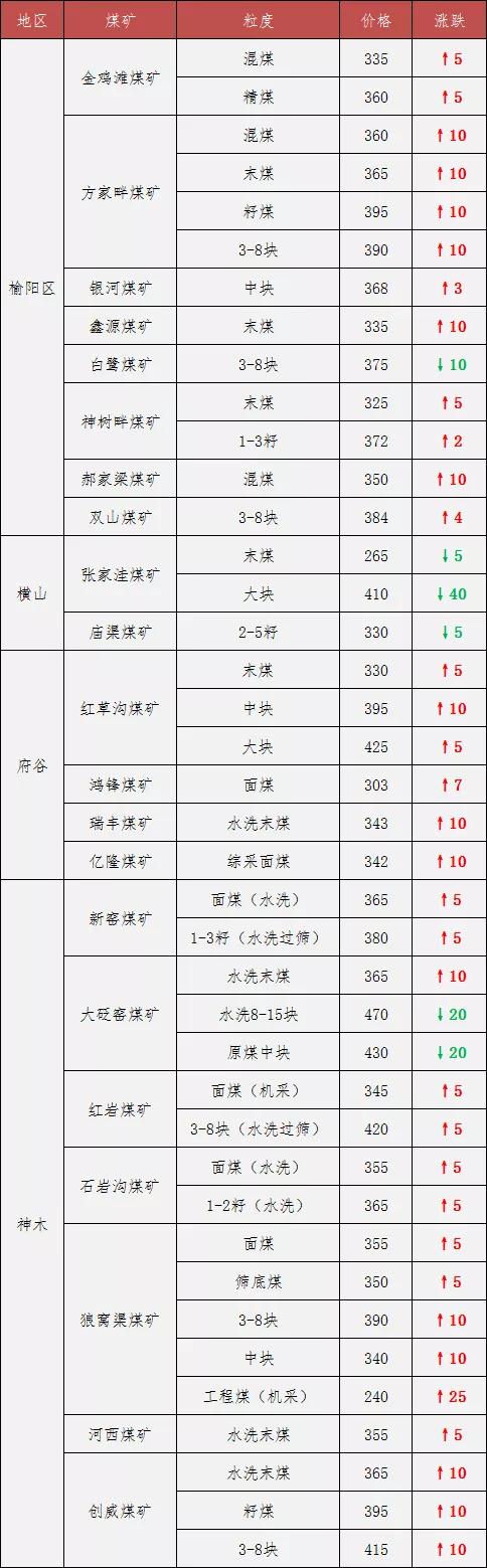 榆林煤價(jià)繼續漲:18家煤礦上調價(jià)格5-10元/噸 周末至今,榆林18家煤礦又上調價(jià)格。據榆林煤炭交易中心數據顯示,截止目前,榆陽(yáng)區(6000k 0.6S)動(dòng)力煤均價(jià)為357元/噸,環(huán)比上漲6元/噸;神木(5800k 0.4S)動(dòng)力煤均價(jià)為339元/噸,環(huán)比上漲5元/噸;府谷(5500K 0.4S)動(dòng)力煤均價(jià)為322元/噸,環(huán)比上漲7元/噸。 最新調價(jià)煤礦: