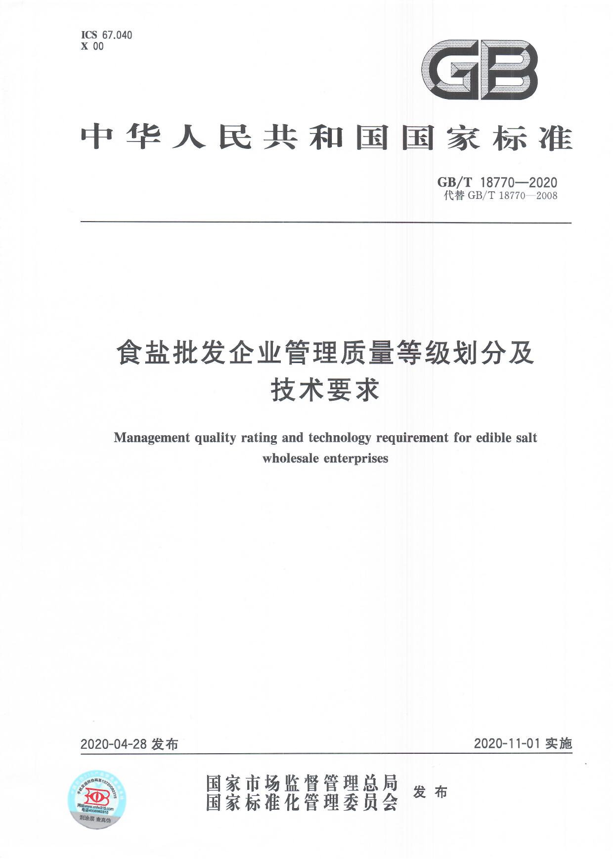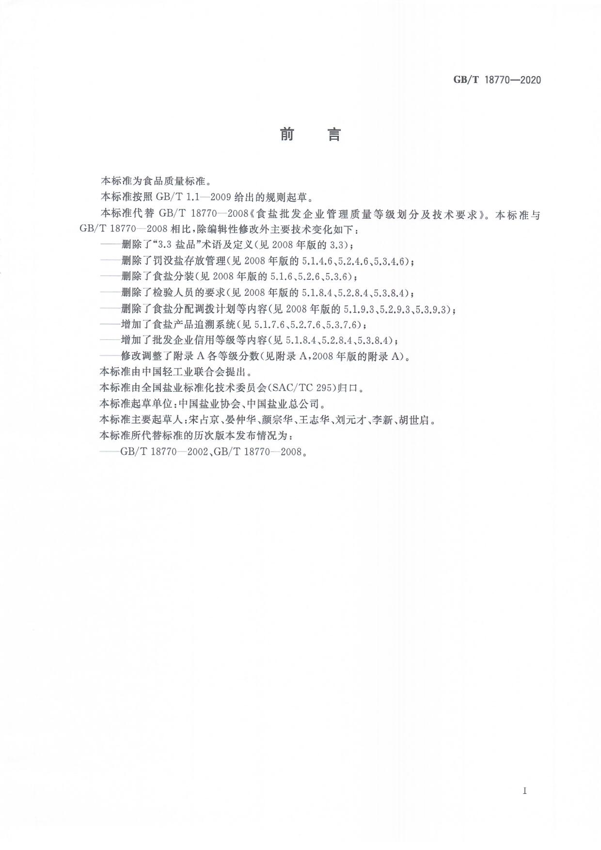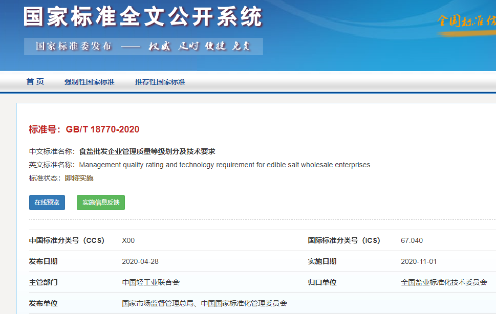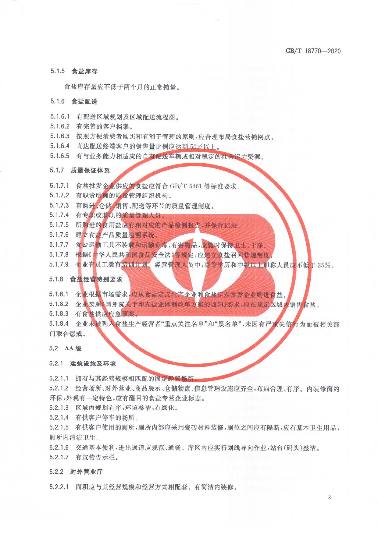 食鹽批發(fā)企業(yè)管理質(zhì)量等級劃分及技術(shù)要求(GB/T 18770-2020)
