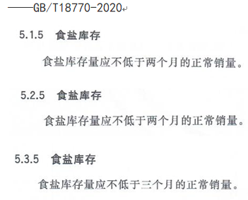 GB/T18770-2020標準提出A、AA級企業(yè)“應不低于”二個(gè)月正常銷(xiāo)量?jì),AAA級企業(yè)“應不低于”三個(gè)月正常銷(xiāo)量?jì),井礦鹽區生產(chǎn)精制鹽按市場(chǎng)需要產(chǎn)出,不象海湖鹽區產(chǎn)場(chǎng)集中生產(chǎn)堆垛,在目前市場(chǎng)競爭條件下難以實(shí)現,能夠達到一個(gè)月正常銷(xiāo)量食鹽儲備都很不錯了。