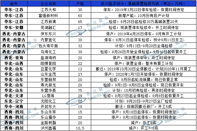 進(jìn)入9月份我國氯堿裝置開(kāi)工情況較為平穩,氯堿檢修企業(yè)較少,開(kāi)工率維持在78%-81%之間。截止9月10日,中國氯堿裝置具體檢修情況如下圖: