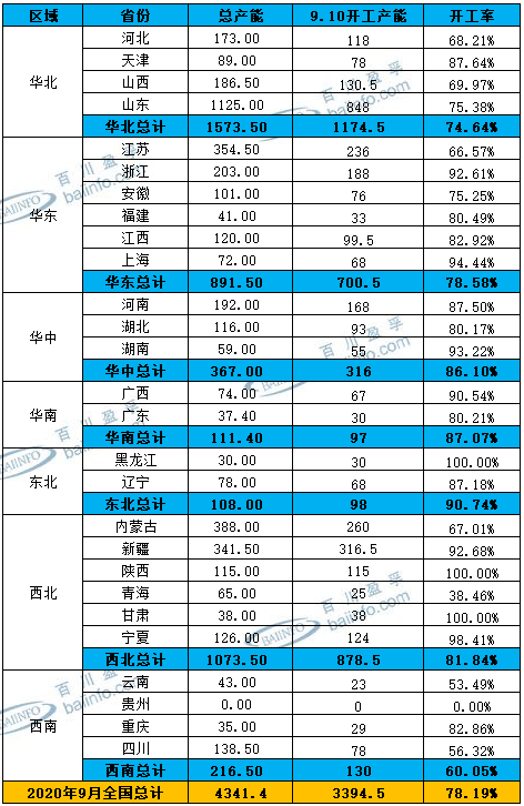 2020年9月份涉及檢修的廠(chǎng)家較少,整體開(kāi)工變化不大,主要因山東、新疆、內蒙、河北等氯堿大省氯堿企業(yè)基本上半年完成檢修工作。