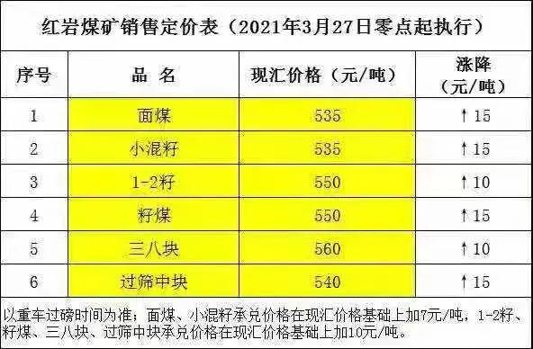 中聯(lián)礦2021年3月28號早上6點(diǎn)價(jià)格調整為:4300大卡原煤285元,5700大卡洗面煤510元,洗一三籽500元,洗二五籽500元,洗三六籽500元,洗三八塊500元,洗四九塊500元。