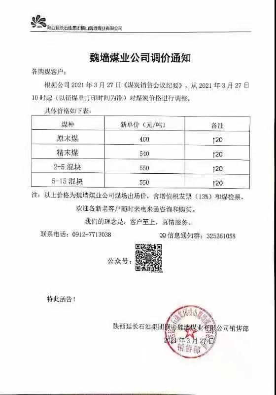 府谷縣老高川鄉恒益煤礦3月27日上午10:00:00時(shí)起,面煤、次精煤、二五籽、四九塊各漲價(jià)10元/噸。