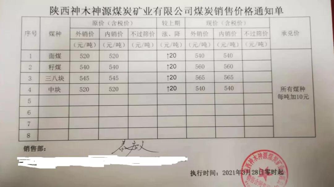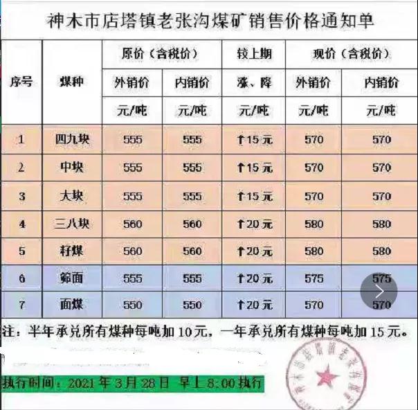 2021年3月26日18:00起,千樹(shù)塔煤礦執行面煤530元/噸,3-8塊580元/噸,8-15塊570元/噸。