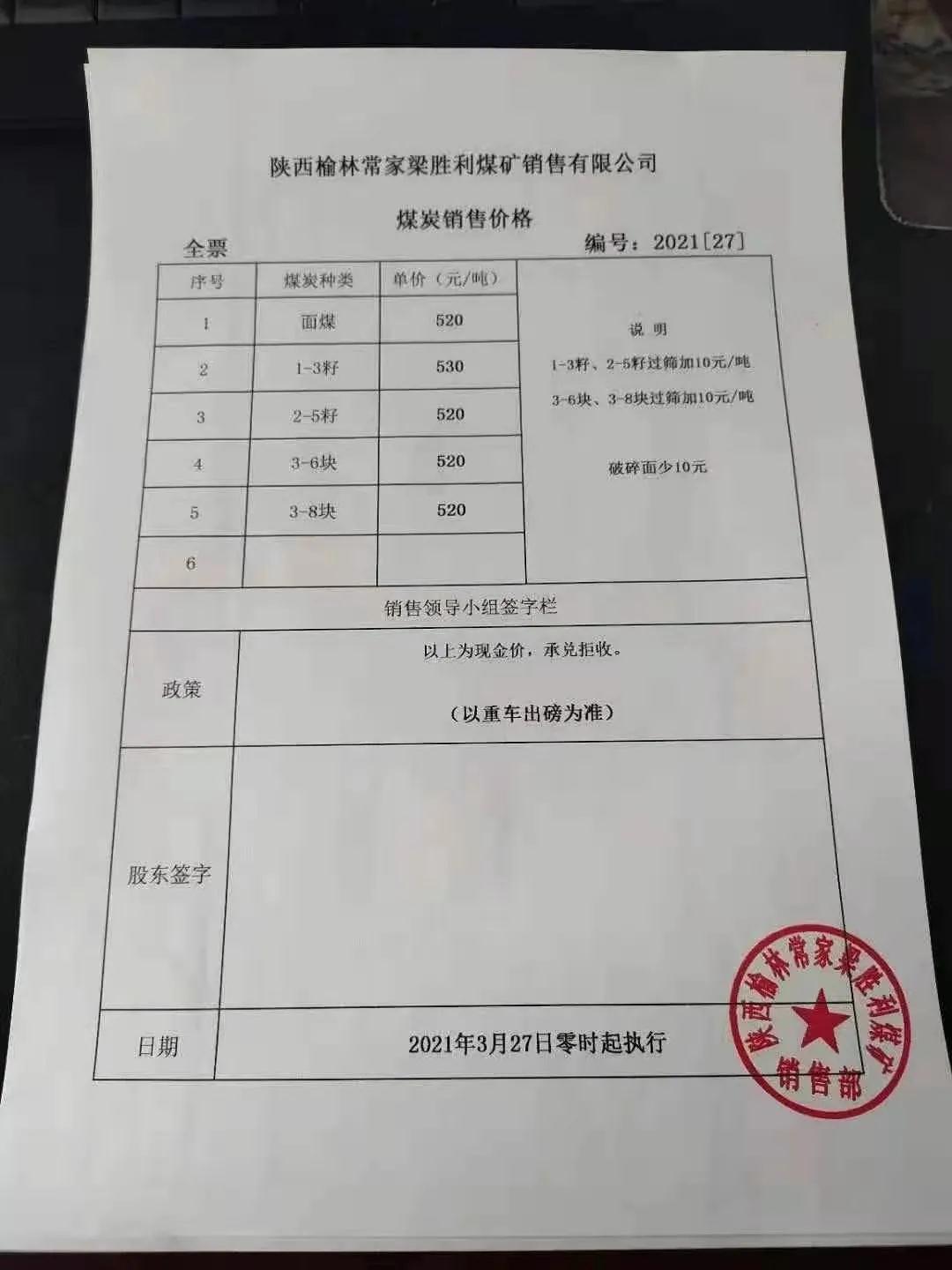 惠寶煤礦3月27日起現金銷(xiāo)售價(jià)格:原煤495元,面煤500元,中塊500元,三八塊520元。