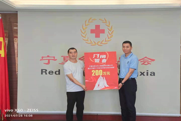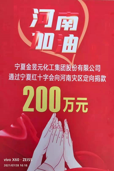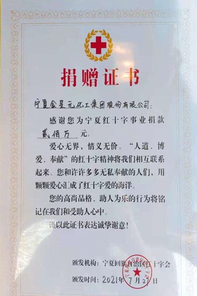 洪災無(wú)情,人間有愛(ài)。7月28日,寧夏金昱元化工集團股份有限公司委托寧夏紅十字會(huì )向河南災區捐助二百萬(wàn)元,馳援河南受災地區,表達對災區人民的深切問(wèn)候。