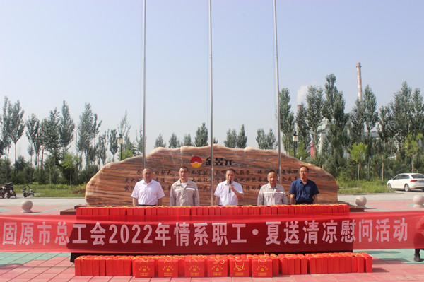 7月8日上午,固原市總工會(huì )常務(wù)副主席王志賢、開(kāi)發(fā)區總工會(huì )常務(wù)副主席羅天、開(kāi)發(fā)區管委會(huì )規劃建設局副局長(cháng)海濱一行,蒞臨寧夏金昱元化工集團股份有限公司固原片區,為堅守在生產(chǎn)一線(xiàn)的員工送來(lái)防暑降溫用品。