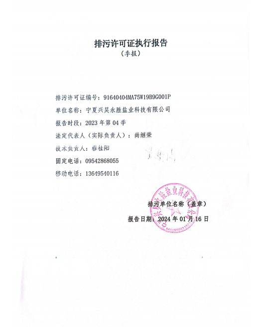 寧夏興昊永勝鹽業(yè)科技有限公司2023年第4季度排污許可執行報告